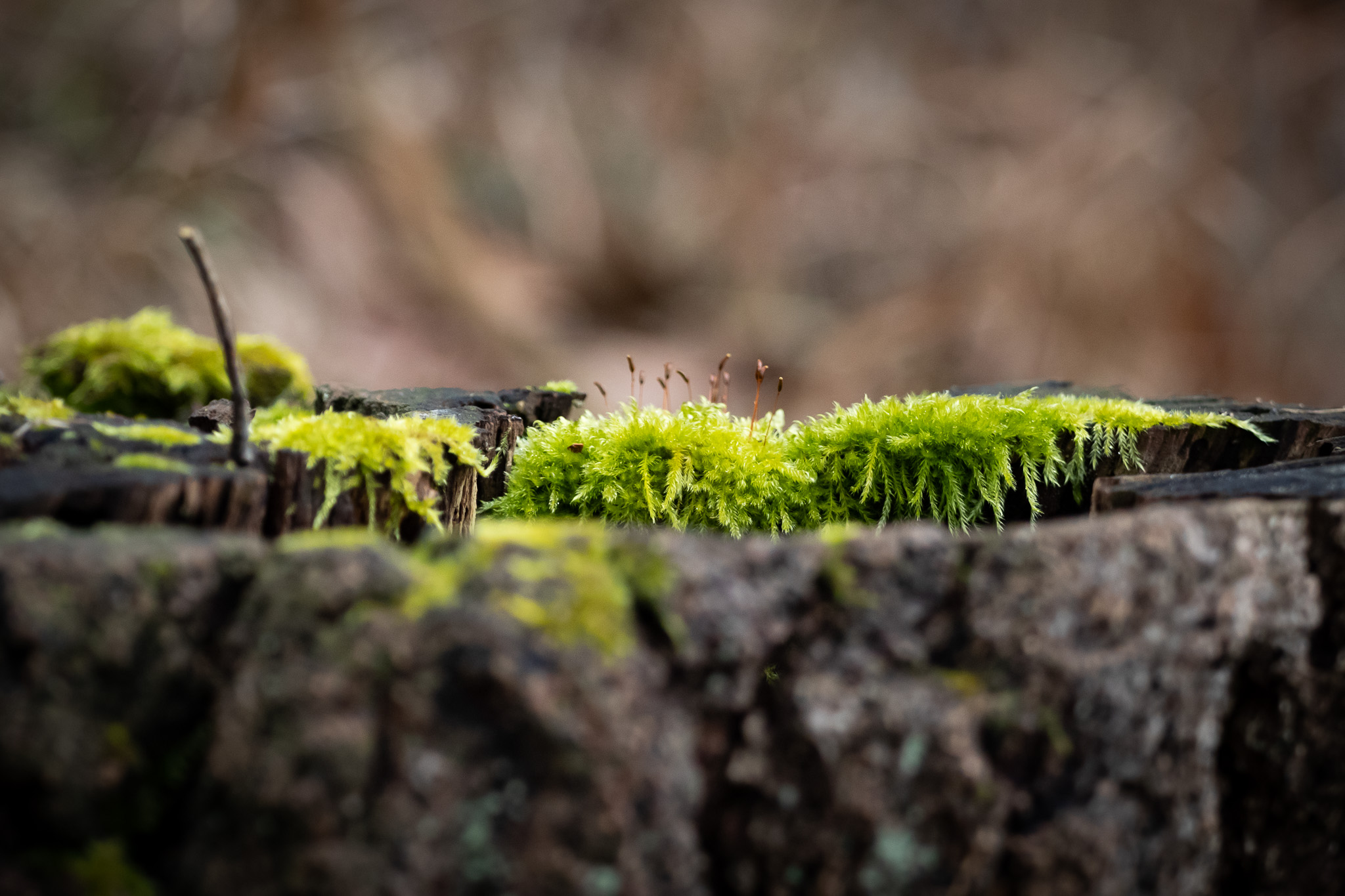 Zwischen den Rissen eines verwitterten Baumstumpfs sprießt zartes Moos empor und bildet einen leuchtend grünen Kontrast zur dunklen, rauen Oberfläche. Die kleinen Sporenträger ragen stolz in die Höhe – ein stilles Symbol für Neubeginn und die Kraft der Natur, auch aus dem Vergänglichen neues Leben zu erschaffen.