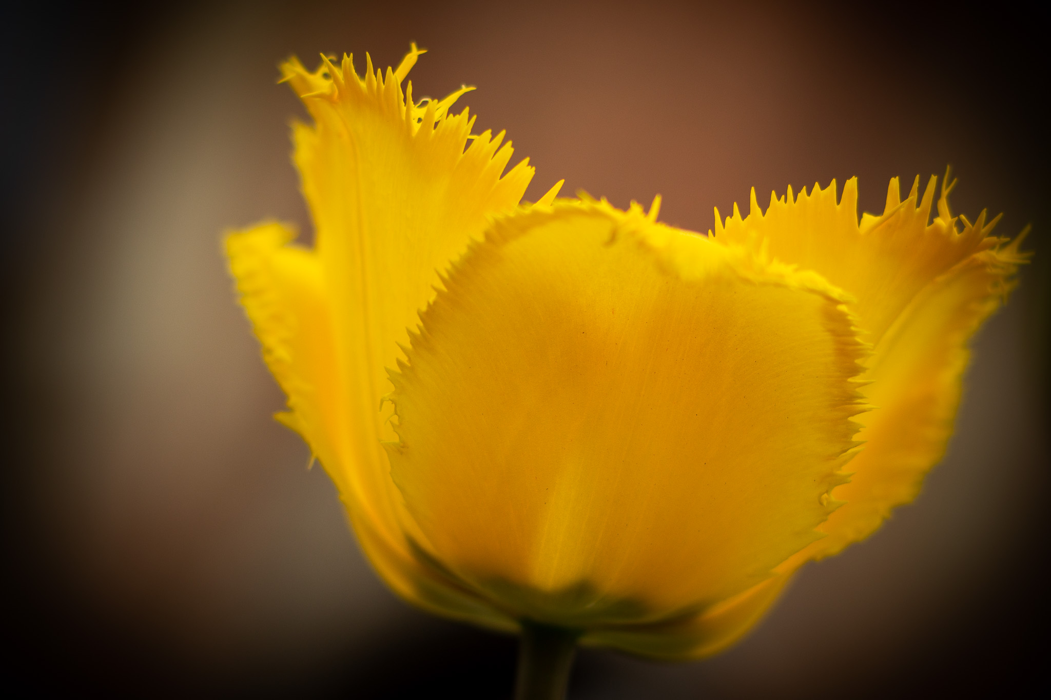 m sanften Licht offenbart sich die zarte Schönheit einer gefransten gelben Tulpe. Die fein gesägten Blütenränder wirken wie kunstvolle Spitzen, während das warme Leuchten der Blüte sich weich vom dunklen Hintergrund abhebt – ein stilles Porträt voller Anmut und Lebensfreude.