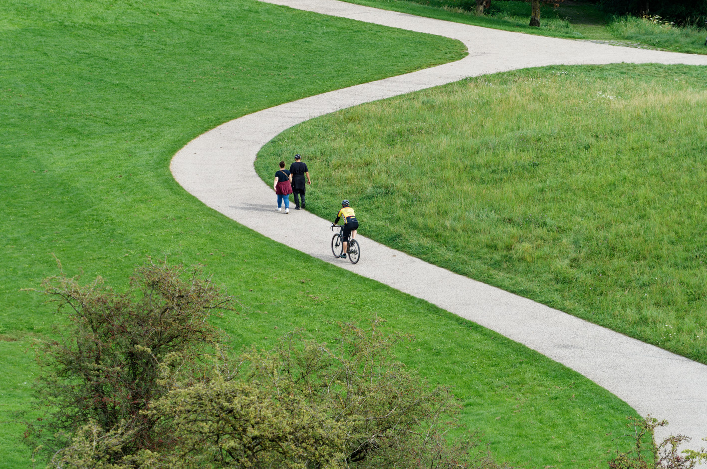 Ein geschwungener Weg durch den Park, auf dem Spaziergänger und Radfahrer zufällig zusammenkommen. Die klare Linienführung kontrastiert mit den natürlichen Formen der Büsche im Vordergrund – Alltagsszene und grafische Struktur in einem Bild.