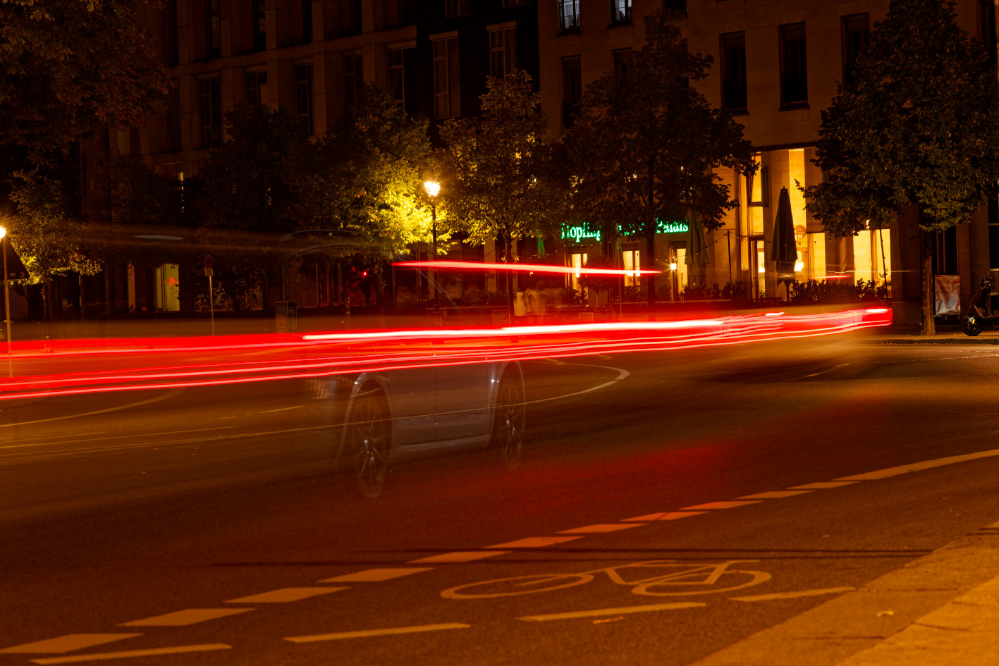 Lichtspuren ziehen durch die Straßen, ein Auto löst sich fast in Bewegung auf – ein kurzer Moment zwischen Stadtlicht und Geschwindigkeit. Langzeitbelichtung macht sichtbar, was dem Auge sonst entgeht.