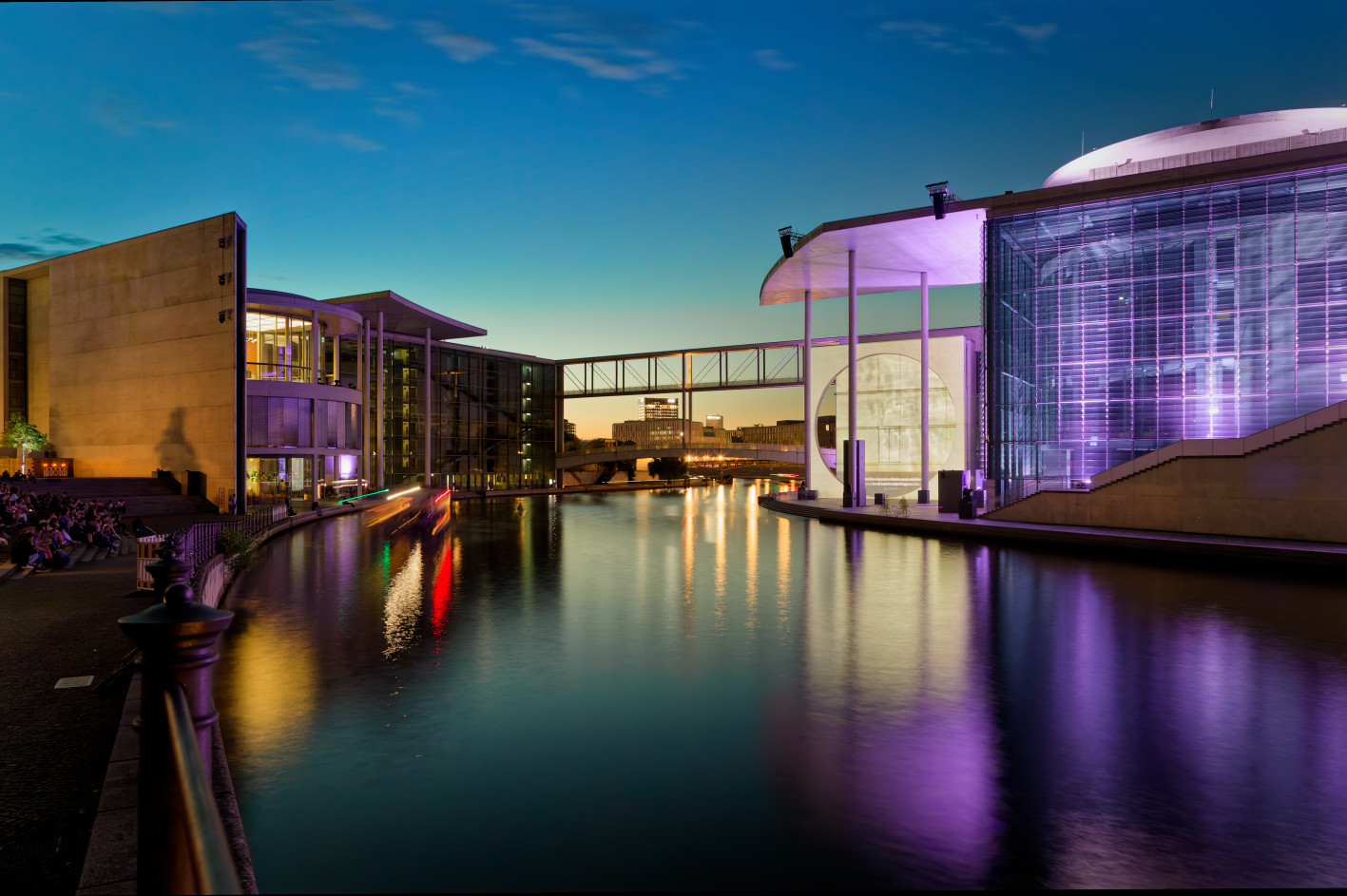 Ein ruhiger Moment in der Hauptstadt – aufgenommen während der blauen Stunde am Marie-Elisabeth-Lüders-Haus in Berlin.