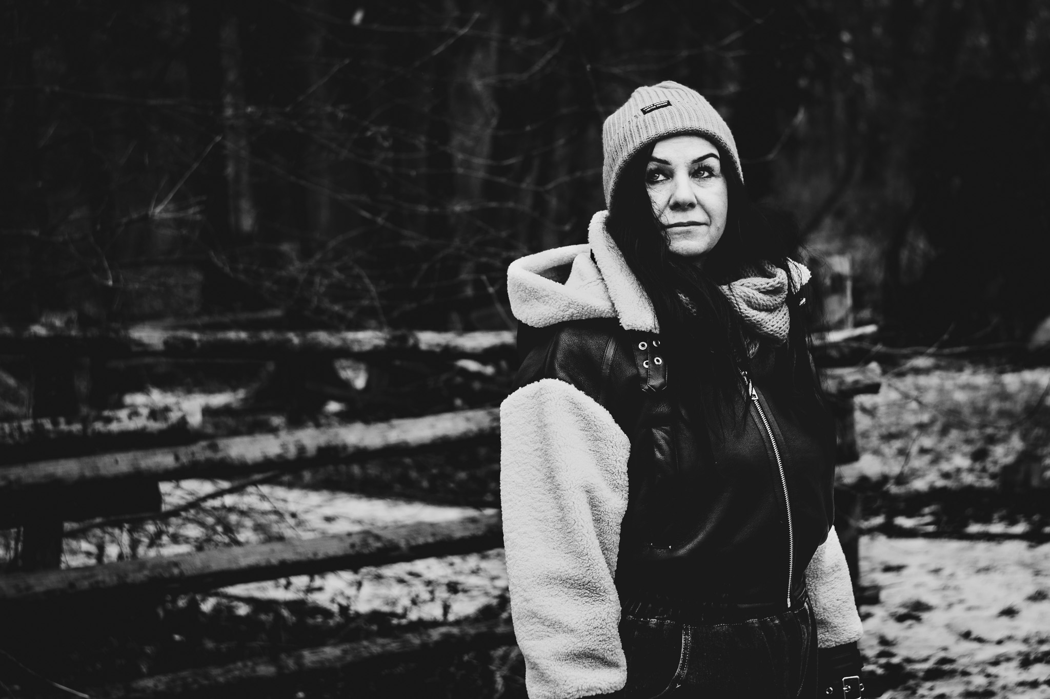 Ein ruhiges Winterporträt in Schwarzweiß: weiches Licht, dunkler Wald im Hintergrund und ein nachdenklicher Blick, der die Szene trägt. Reduziert auf Kontrast und Ausdruck – ganz ohne Ablenkung.