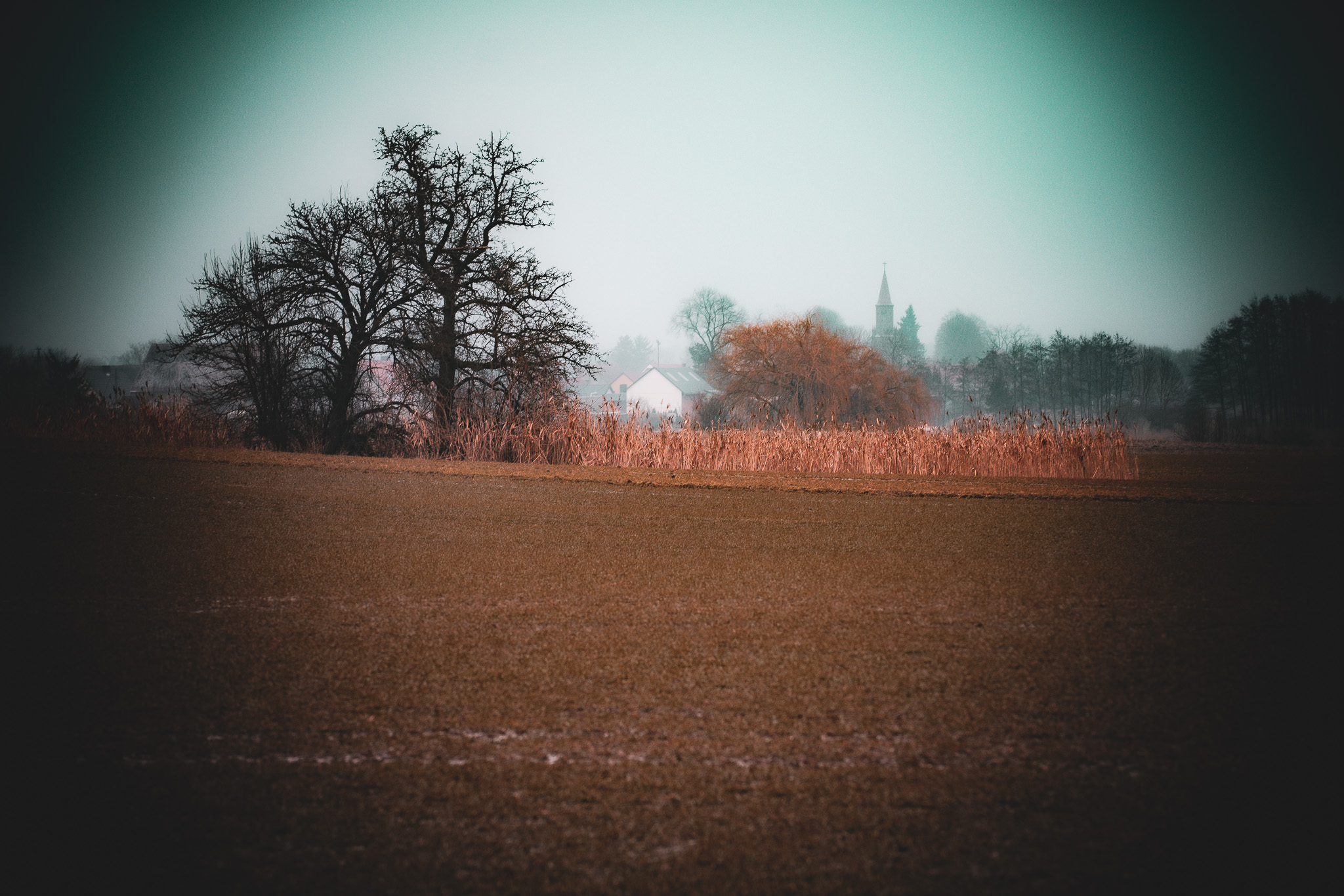 Gedämpfte Farben, weiche Konturen – und ein Kirchturm als stiller Fixpunkt im Hintergrund. Der Nebel schluckt Details, lässt aber genug Raum für Stimmung und Ruhe.