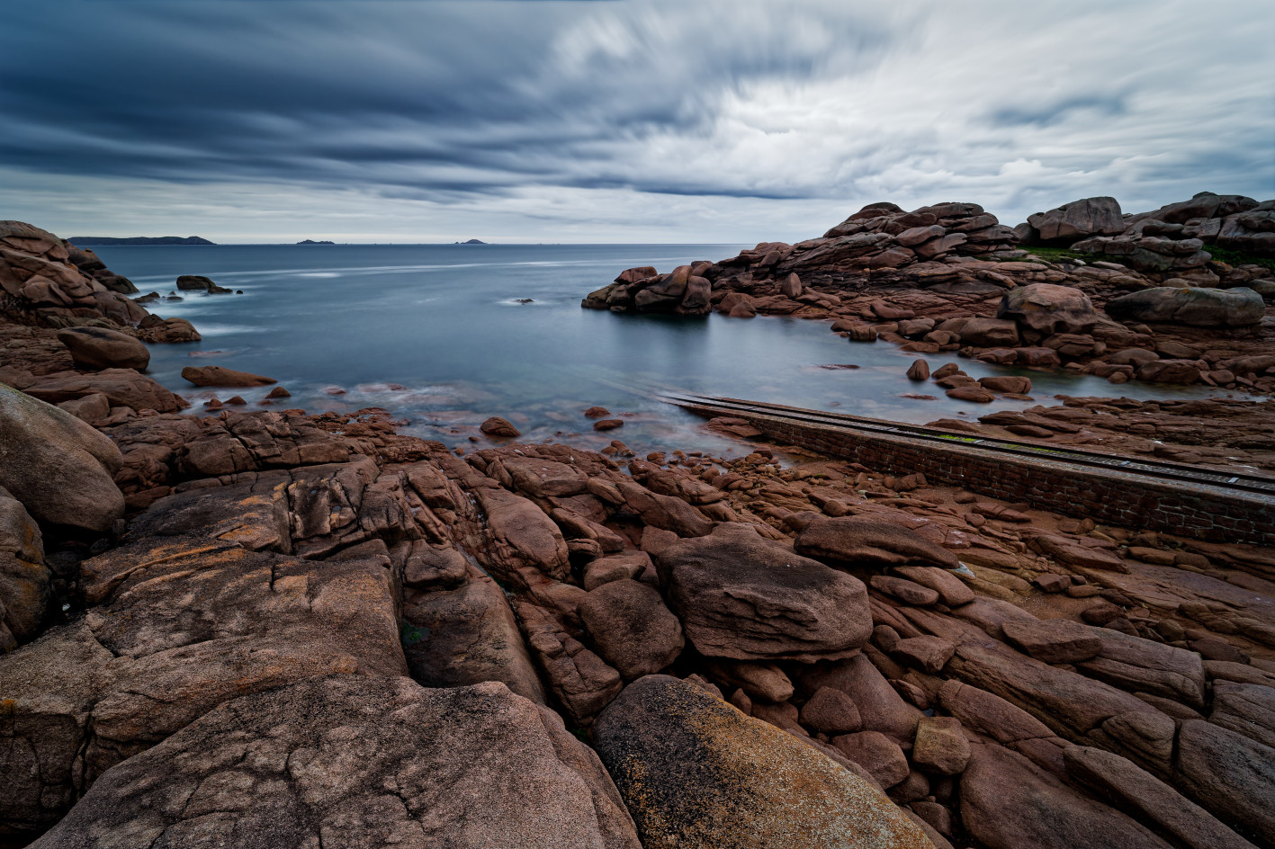 Roter Granit, ruhiges Wasser und ein Himmel in Bewegung. Die lange Belichtung glättet die See, während Wolken und Küstenlinie die Szene dynamisch halten – wild und gleichzeitig meditativ.