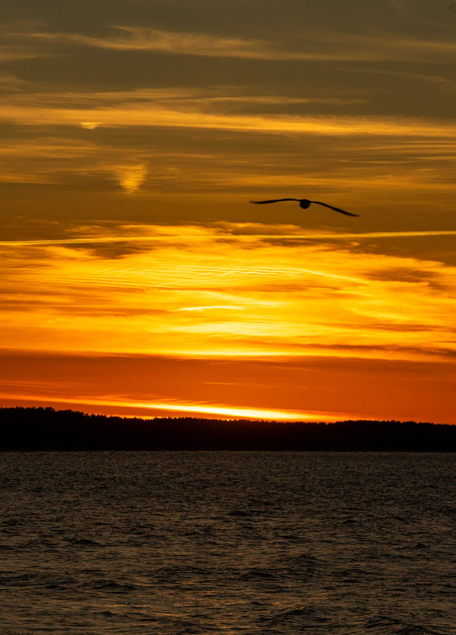 Möve fliegt in den Sonnenuntergang
