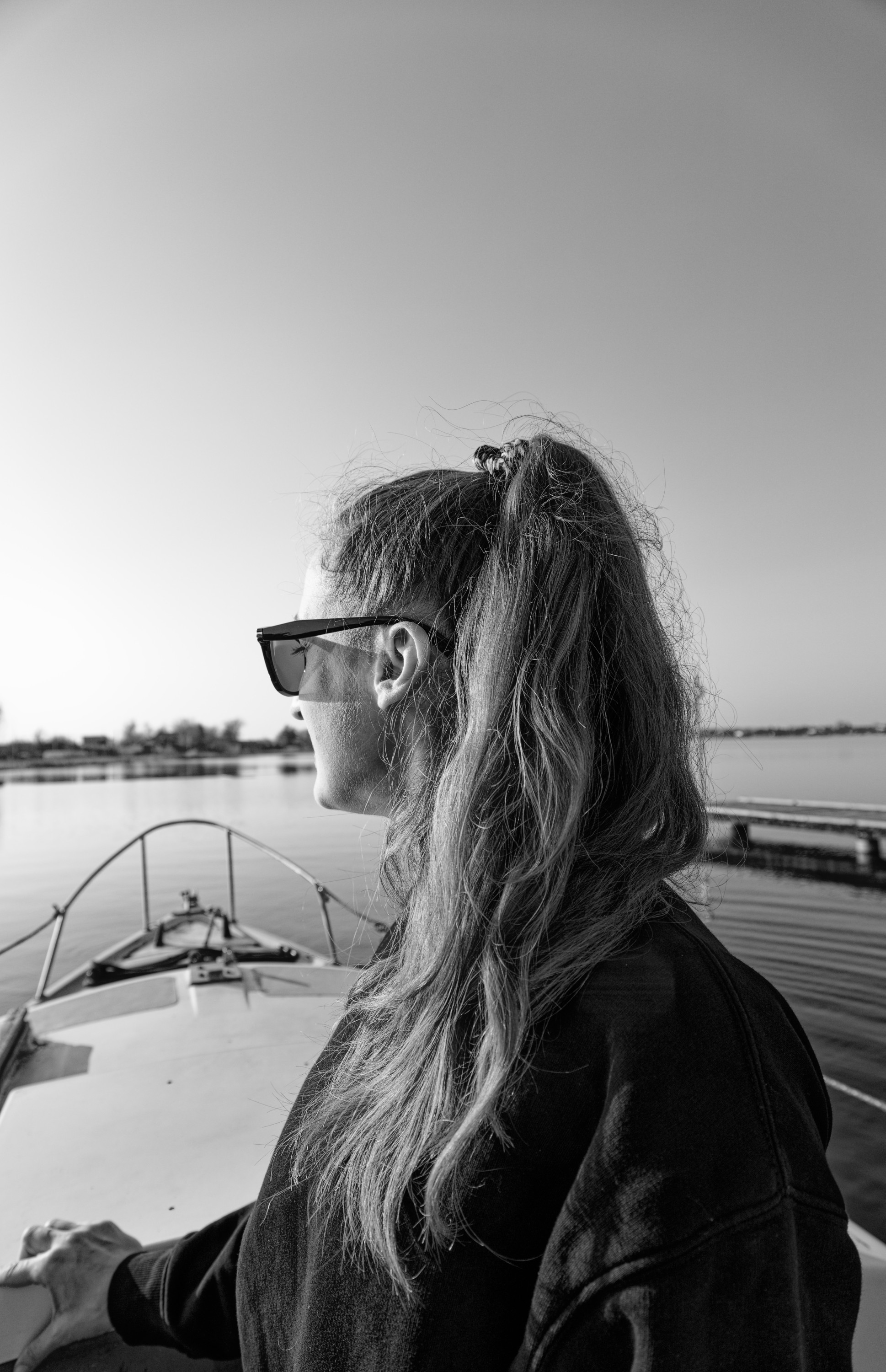 Eine Frau genießt die friedliche Weite eines Sees, während sie auf einem Boot steht. Ihr Blick schweift in die Ferne, eingefangen in einem stillen, nachdenklichen Moment. Die Schwarz-Weiß-Aufnahme verstärkt die zeitlose Atmosphäre dieses Augenblicks der Freiheit und Gelassenheit.