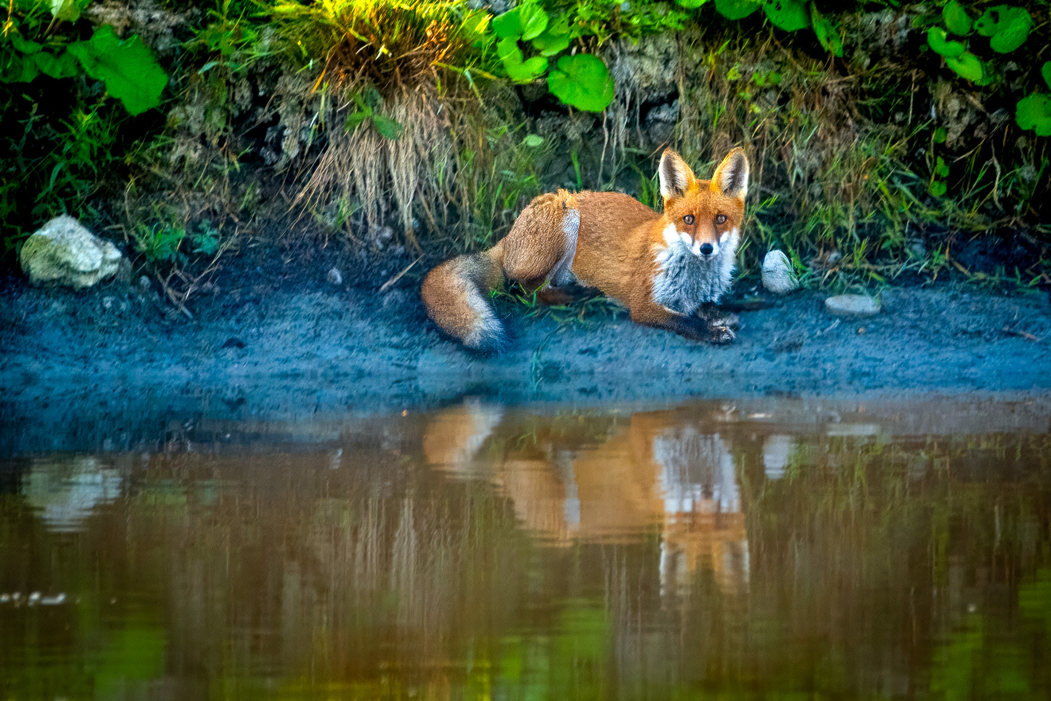 Ein spontanes Bild, der Fuchs lag gemütlich am Teich, ich musste aber erst mein Tele an die Kamera bringen, trotz 600er noch dichter hingehen um am Ende dieses Foto zu erhalten. Ein paar Sekunden später ist der dann geflüchtet.